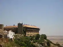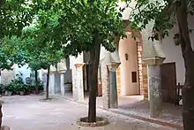 The Seville gate and its bastion were built by the Carthaginians before the Second Punic War, probably dating from 220–230 BC.[3] The Romans later made several modifications, focusing on reconstruction of the gate which allowed access to the walled town, and the sally port, located slightly north of the stronghold. They also made several changes to the bastion itself, which, like the gate, still exists. The Seville gate consists of two vaulted spaces framed by two arches above a courtyard forming an intervallum (a clearing between the walls and the city), while the sally port is made up of two arches that frame a space covered with a barrel vault. Both works date from the first half of the 1st century BC. In the bastion of the stronghold, major Roman additions included the construction of a curtain wall, or facing, called a cortina, which augmented the structure's height, and a temple built in the second half of the 1st century BC of which the only remains are the podium on which it stood.