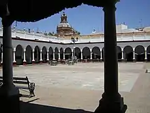 Carmona's forum was located, as customary in Roman-built cities, at the junction of the Cardo Maximus and the Decumanus Maximus, in what is now the Plaza de Arriba, which has persisted over time as a public centre of the city. There is little archaeological data to indicate the forum's exact structural details. At an excavation site on the Plaza de San Fernando, the remains of a large building dating to the 1st century indicate it was an edifice with a public function. Its plan corresponds to the layout of a Roman forum, and so far a porticoed walkway and a macellum have been exposed. There are also remains of another building made of hewn stone ashlar blocks in the Convent of Madre de Dios that shows features suggesting a building with a civic use.