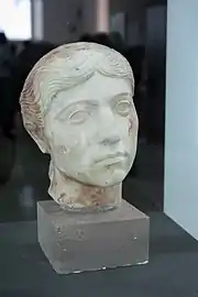 Roman Carmo's early remains are buried in the area extending from the present Ayuntamiento to the Plaza de Abastos, where a late neolithic dolmen was discovered in 1888.[3] Some graves from the Carthaginian period dating to the 5th century have been found as well. The name of a certain Urbanibal, a person of Carthaginian descent who lived during the Roman period, is preserved on a funeral urn discovered in the Roman cemetery and now displayed in the Carmona City Museum (Museo de la Ciudad de Carmona).[38] The bodies were cremated in crematories excavated in the rock, where the funeral pyre stood. Sometimes these crematories were also used for burials; the ashes were deposited in them, then they were covered with stone blocks, bricks, and tegulae. A stele was placed to indicate their location and the name of the deceased.[39] [40]