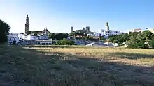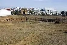 The oldest settlement in the area around present-day Carmona corresponds to the El Campo Real zone, a geological formation located on the first uplift of the ridge of the Los Alcores plateau, southwest of the historical centre of Carmona, and separated from it by a deep depression.[21] In 1898 George Bonsor discovered a total of forty-two silos excavated in the rock here, some of them containing burials. This site appears to date from the end of the Neolithic through the Chalcolithic.[22]