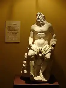 Tradition places a Roman public baths facility near the present Iglesia de San Bartolomé (Church of St. Bartholomew). Recent excavations at a site under the street Calle Pozo Nuevo in the San Felipe barrio uncovered the water heating system of what appear to be the public baths of Carmona, dating to the 2nd century, as well as part of what is either the pool (piscina) of a bath-house or a very large water cistern (nymphaeum).[44] These structures, which faced the sun, and the cisterns that supplied them, are being documented and studied in the archaeological conservation process. In 1923 a Roman mosaic with images of the Gorgon Medusa at its centre, and goddesses representing the four seasons in each corner, was discovered here. The mosaic has been moved and is now preserved in the central courtyard of the City Hall.[45]