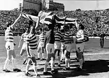 Celtic players raising a flag of Uruguay at Estadio Centenario before the 1967 Intercontinental Cup playoff v. Racing Club