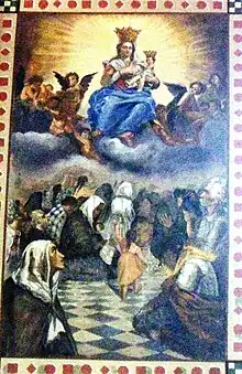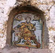 In the "new" Cerreto there was a real potters' quarter located near the Cathedral. During the renovation of several dwellings located in that area, remains of kilns for firing terracotta and ceramics were found.[64] In this "insula dei faenzari" were the workshops of Francesco Iadomaso, from Cerreto, and Carlo Coluccio, from Campobasso. In the same area stood the workshop of Nicolò Russo, a master ceramist who moved from Naples in 1693. In his workshop worked many young apprentices who during the 18th century became the main exponents of Cerretese ceramics: Domenico Marchitto, Santi Festa, Melchiorre Cerri, Nicola and Crescenzo Petruccio, Nicola Marchitto, Salvatore Paduano, and Giuseppe Paolino. Russo executed numerous works in Cerreto Sannita including several floorings in religious architecture.[65]