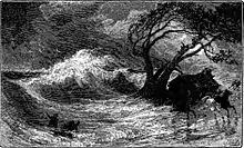 In 1876 art student Howard Pyle visited Chincoteague. He wrote of his experiences, including viewing the pony penning (which took place behind his hotel), the following year in Scribner's Magazine, accompanying the text with the first known contemporary drawings of the event.[23] Pyle was struck by the quaintness of Chincoteague, describing it as "an enchanted island, cut loose from modern progress and left drifting some seventy-five years backward in the ocean of time".[24] The publicity in a national magazine did nothing to reduce the crowds coming to Chincoteague for the penning.[23]