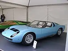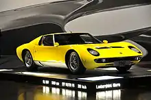 The car's rolling chassis, featuring an unusual transversely mounted mid-engine layout, was displayed at the Turin Salon in 1965, impressing showgoers. A version with bodywork styled by Bertone designer Marcello Gandini was finished only days before its debut at the 1966 Geneva motor show. As had happened three years earlier at the debut of the 350GTV, an ill-fitting engine meant the prototype's engine bay was filled with ballast, and the engine compartment was kept locked.[13] The favorable reaction to the P400 at Geneva led Lamborghini to slate the car for production by 1967, under the name Miura. The Miura's layout and styling would become the standard for mid-engine two-seat high-performance sports cars,[14] a trend that continues today.