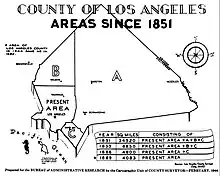 - ↑ California Historical Survey Commission., Coy, O. Cochran. (1923). The genesis of California counties. [Sacramento]: [California State Print. Office, F.J. Smith, superintedent]. Appendix II: History of the boundaries of Los Angeles County, with map