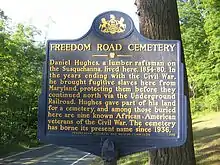 Daniel Hughes was a conductor in the Underground Railroad based in Loyalsock Township and Williamsport. He was the owner of a barge on the Pennsylvania Canal and transported lumber from Williamsport on the West Branch Susquehanna River to Havre de Grace, Maryland.[13] Hughes hid runaway slaves in the hold of his barge on his return trip up the Susquehanna River to Lycoming County, where he provided shelter on his property near the Loyalsock Township border with Williamsport before moving further north to eventual freedom in Canada.[14] Hughes's home was located in a hollow or small valley in the mountains just north of Williamsport. This hollow is now known as Freedom Road, having previously been called Nigger Hollow.[14] In response to the actions of concerned African-American citizens of Williamsport, the pejorative name was formally changed by the Williamsport City Council in 1936.[13]