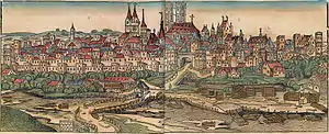 Another devastating fire destroyed parts of the city in 1429. Since the town fathers considered themselves threatened by the Hussites, the fortification was extended. In the late 15th century Munich underwent a revival of gothic arts—the Old Town Hall was enlarged, and a new cathedral—the Frauenkirche—constructed within only twenty years, starting in 1468. The cathedral has become a symbol for the city with its two brick towers and onion domes.