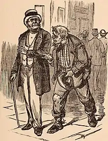The new Republican Party in the late 1850s attempted to cut the power of Mayor Fernando Wood and other pro-South Democrats by abolishing the New York City Municipal Police Department in favor of a Metropolitan Police District.[2] Resistance resulted in the New York City Police Riot of 1857. While the police were busy with their feud, the Dead Rabbits Riot between two gangs in Five Points occurred in July, lasting two days, and was stopped only by intervention of the state militia. It was the worst riot in New York City up to that time.[3][4] Historian Tyler Anbinder says the "Dead Rabbit" name "so captured the imagination of New Yorkers that the press continued to use it despite the abundant evidence that no such club or gang existed." Andbinder notes that, "for more than a decade, 'Dead Rabbit' became the standard phrase by which city residents described any scandalously riotous individual or group."[5]