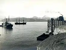 Northern Exploration Company had conducted trial operations with mining on Blomstrandhalvøya, a headland across Kongsfjorden from Ny-Ålesund, in 1906.[22] The British company set forth claims to the southern part of the bay in 1919, arguing that they had conducted a valid occupation of that area as well.[23] An agreement was struck between the British company and the Government of Norway on 26 October 1925, whereby two-thirds of the land in question was waived and variously given to Kings Bay, Kulspids, Stavanger Spitsbergen and the government for £37,000. The remaining areas were bought by the state in 1932.[24] Falling coal prices led to a production halt during the winter of 1925–26, in which only 17 men stayed the winter.[25] Ordinary operations resumed in 1926, with production commencing in the Ester Mine.[24]