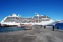 The docks received a total renovation in 1992 for NOK 18 million, allowing cruise ships to dock in port.[114] The following year a 60-person café was completed.[115] The Norwegian Mapping Authority completed its continental drift station in 1994, at the same time as a satellite communication link opened on Zeppelinfjellet.[116] By 1996 there were over one hundred research projects in Ny-Ålesund,[117] and the town reaches a capacity for 200 people two years later.[118] On 6 May 1998, Kings Bay Kull. Comp A/S changes its name to Kings Bay AS.[119] The same summer the North Pole Hotel was finished refurbished and opened as the world's northernmost hotel.[120] That year also saw the annual number of researcher-days exceed 15,000.[121] In March 1999 the Norwegian Polar Institute opened its new 700-square-meter (7,500 sq ft) Sverdrup Station.[122] The original building on Zeppelinfjellet was demolished and replaced with a new facility.[123]