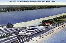Emergency Hospital, the first hospital in the area, opened in 1914. Two years later, the Pine Ridge Hospital opened and it remained the only hospital in the area to serve blacks until the end of segregation in the 1960s.[48] In 1915, the southern portion of Palm Beach County and the northern portion of Dade County were partitioned to create Broward County.[39] Another change to the county's boundaries occurred two years later, when the northwest corner of Palm Beach County became part of Okeechobee County.[49] Construction began on a new courthouse in West Palm Beach at 3rd Street and Poinsettia Street (Dixie Highway) in 1916, which opened during the following year. The completion of the West Palm Beach Canal also occurred in 1917.[44] With the western terminus at Lake Okeechobee at Canal Point, the canal allowed for crops to be shipped directly into West Palm Beach and then along the Florida East Coast Railway. Consequently, the canal spurred population growth at Canal Point and Pahokee,[42] and caused settlement at Loxahatchee Groves (though incorporation did not occur until 2006), whose founders envisioned a "waterfront" farming community in the central interior of Palm Beach County.[50] The completion of two other canals during the decade led to settlement at South Bay in 1912 and Belle Glade in 1918,[51][52] along with many other smaller communities near Lake Okeechobee.[51] Industrial Junior and Senior High School opened in West Palm Beach in 1917 as Palm Beach County's first high school for African-American students.[53] The late 1910s also marked the beginning of Addison Mizner's influence on South Florida architecture, with the Everglades Club opening in Palm Beach in 1919.[44]