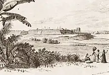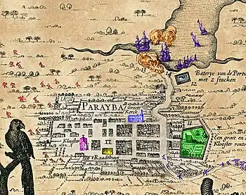 On the 18th, without the knowledge of the governor, the captains of Cabedelo Fort, Gregório Guedes Souto Maior and Gaspar de Valcaçar surrendered to the Dutch. Antônio Albuquerque, who was at the Santo Antônio Fort, heard about the loss of the Cabedelo Fort and went to take refuge in the chapel of Our Lady of Guia. Captains Valcaçar, Munoz and Palomo, who had arrived with reinforcements, saw that the fort was unable to resist and surrendered on the morning of the 23rd after negotiations. On hearing of the capitulation, the Count of Bagnuolo, who was in Filipeia, ordered the burning of the houses and the stocks of sugar and brazilwood, in order to leave no spoils for the winners. He also ordered the occupants of the Viradouro Fort to take as many cannons as they could carry and withdraw inland to mount a resistance. Antonio Albuquerque and his companies set fire to three ships and two warehouses loaded with sugar and left for the interior. On the 24th, Christmas Eve 1634, the Dutch entered the abandoned town of Filipeia de Nossa Senhora das Neves.[58][59][60]