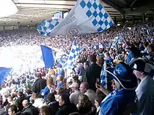 Queens made it to the League Cup semi-final in 1960–61 for the second and to date last time.[7] Farm was made player manager in 1961. Fast and tricky right winger, Ernie Hannigan (he later said, "Going to Queen of the South turned out to be a great move"),[2] and future Scotland centre forward Neil Martin (44 goals in 78 Queens games), joined in '61 and formed a partnership (they would later play together in England's top division with Coventry City).[5] With Jim Patterson still at Queens the club were promoted back to the top division in 1962 where it played again for two seasons (beating Celtic at Parkhead in 1962–63).[2] Queens have not played top division football since 1963–64.[2]