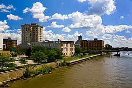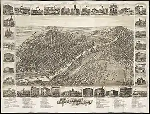 On June 28, 1889, the Michigan Legislature passed Act 455 to consolidate the City of Saginaw and the City of East Saginaw into a new city that also was named the City of Saginaw.[10][11] Prior to this consolidation, the village of Salina had already been added to the City of East Saginaw. The consolidation of the City of Saginaw became effective with the election of officers on March 12, 1890.[11] The provisions of the city charter were established by the same act of the legislature that provided for the consolidation. The city was governed by a city council consisting of two aldermen elected from 21 wards and an executive mayor who had fairly weak powers because numerous other elected officials and elected or appointed boards controlled much of the administrative and executive functions of government. The efficient and cohesive functioning of the city's government also was constrained by remaining rivalries between residents, business owners, and politicians from the former two cities. The distinctions and rivalries between the east and west sides of the City of Saginaw persisted throughout the ensuing century in various forms, and influences Saginaw's political and economic experiences even at the present time.[12]