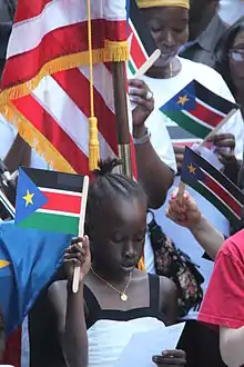 As promised by the Comprehensive Peace Agreement southern Sudan held an independence referendum in 2011.[20] Voting in the referendum was open from 9 January to 15 January. 98.83% of voters voted in favour of independece with a 99& turnout. At midnight on 9 July 2011, southern Sudan became an independent country under the name "Republic of South Sudan".[21] On 14 July 2011, South Sudan became the 193rd member state of the United Nations[22][23] and on 28 July 2011, South Sudan joined the African Union as its 54th member state.[24]