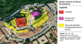 In 1140 the territory of Tocco became part of the county of Manoppello,[18][19][20] and from the 13th century the urban center was developed in stonework around the two most important buildings in the settlement at that time, the church of St. Eustace (whose existence was already reported in the Chronicon Casauriense on July 1, 1169)[21] and the castle (rebuilt at the behest of Frederick II of Swabia).[18]
