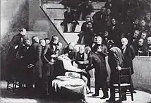 Such displays of the anaesthetic qualities of mesmerism inspired some medical practitioners to attempt surgery on subjects under the spell of magnetism.[92] In France, the first major operation of this kind had been trialled, apparently successfully, as early as 1828 during a mastectomy procedure.[93] In Britain the first significant surgical procedure undertaken on a patient while mesmerised occurred in 1842 when James Wombell, a labourer from Nottingham, had his leg amputated.[94] Having been mesmerised for several days prior to the operation by a barrister named William Topham, Wombell exhibited no signs of pain during the operation and reported afterwards that the surgery had been painless.[95] This account was disputed by many in the medical establishment who held that Wombell had fraudulently concealed the pain of the amputation both during and after the procedure.[96] Undeterred, in 1843 Elliotson continued to advocate for the use of animal magnetism in surgery publishing Numerous Cases of Surgical Operation without Pain in the Mesmeric State.[97] This marked the beginning of a campaign by London mesmerists to gain a foothold for the practice within British hospitals by convincing both doctors and the general public of the value of surgical mesmerism.[98] Mesmeric surgery enjoyed considerable success in the years from 1842 to 1846 and colonial India emerged as a particular stronghold of the practice; word of its success was propagated in Britain through the Zoist and the publication in 1846 of Mesmerism in India and its Practical Application in Surgery and Medicine by James Esdaile, a Scottish surgeon with the East India Company and the chief proponent of animal magnetism in the subcontinent.[99]