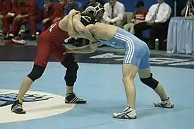 Wrestlers such as Abraham Lincoln did not settle for the collar-and-elbow as much as in a free-for-all style of wrestling that was widespread on the frontier.[1] Since "catch-as-catch-can" wrestling was very similar, it gained great popularity in fairs and festivals in the United States during the 19th century.[3] The collar-and-elbow style was also refined by later Irish immigrants, and gained great ground because of the success of George William Flagg from Vermont, the wrestling champion of the Army of the Potomac. After the Civil War, freestyle wrestling began to emerge as a distinct sport, and soon spread rapidly in the United States. Professional wrestling also emerged in the late 19th century (not like the "sports-entertainment" seen today). At the time of the first New York Athletic Club tournament in 1878 professional championship wrestling matches "offered purses of up to $1,000."[3] By the 1880s, American wrestling became organized, with matches often being conducted alongside gymnastic meets and boxing tournaments in athletic clubs. The first national competition took place in 1887, with L. Chenowith of the Pastime Athletic Club winning the only weight class at 134 lb. The next year the Amateur Athletic Union (AAU) sanctioned its first national tournament, and soon became recognized as the governing body of American wrestling.[1] The first college student-athlete to win a national championship was Winchester Osgood, a football player at the University of Pennsylvania, who won the 1895 National AAU Championship at the heavyweight division (then for wrestlers over 158 lb). Wrestling before the 20th century was dominated largely by independent athletic clubs and not by educational institutions. Prominent athletic clubs with wrestling teams included the National Turnverein of Newark, New Jersey, the Schuylkill Navy Athletic Club, St. George's Athletic Club, the Chicago Central YMCA, the Olympic Club of San Francisco, as well as various athletic clubs associated with ethnic groups such as the Chicago Hebrew Association. The National Turnverein produced George Nicholas Mehnert, who won six national AAU championships between 1902 and 1908 and lost only one of more than 100 matches to George Dole, then a student at Yale University. Mehnert was also a gold medalist at the Olympics of 1904 and 1908.[1] Despite wrestling not yet being regulated by colleges and universities, hundreds of participants attended wrestling tournaments. The growth of cities, industrialization, and the closing of the frontier provided the necessary avenue for sports such as wrestling to increase in popularity.[3]