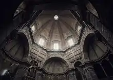 The Medici Chapel in Florence was designed by Michelangelo and built between 1521 and 1534. It contains the tombs of Giuliano and Lorenzo de' Medici.[32] In 1569, the dome over the church of Madonna dell'Umiltà in Pistoia was completed by Giorgio Vasari at the behest of Cosimo I de' Medici, over a building designed and built by others. Although clearly referencing Florence Cathedral visually and in the use of two shells, structurally the octagonal dome is similar to the much earlier dome of Florence Baptistery and the hemispherical shape of Michelangelo's design for the dome of St. Peter's Basilica. Cracks discovered shortly after completion necessitated the addition by Vasari of iron chains on the inside and outside, but structural problems have continued and additional chains have been added over the centuries, many outside of the dome. The instability has been attributed to Vasari's design.[52]
