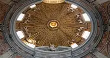 Francesco Borromini's dome of San Carlo alle Quattro Fontane (1638–41) has a novel oval plan that approximates an ellipse using four circular arcs based on the vertices of two large equilateral triangles; a complex geometrical coffer pattern of crosses, octagons, and lozenges is repeated eight times on the dome's inner surface.[97][7][96] Because the dome uses a pattern of coffers that get smaller as they approach the oculus and because it is lit from both above and below, the dome appears lighter and higher than it would otherwise. The church inaugurated the high baroque style in Rome.[98] A copy based on plans provided by Borromini was built as the church of Madonna del Prato in Gubbio.[99]
