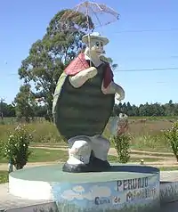 Among all the styles that emerged in this period, it was the gato that achieved the greatest popularity and became the favorite of the gaucho culture.[45] The gato, a lively and picaresque style, introduced in the 1830s, also the relaciones, a type of humorous couplets that the dancers recite when the music stops, which were also performed in the cielito, the pericón and the aires.[46] In the following decades the relaciones would be combined with the "aro-aro", characteristic of the cueca, a shout uttered by those attending the dance or by the musicians, with the virtue of instantly suspending the music, to give way to a moment of toast or humorous relations.[47] This custom of combining humor and music would pass in the second half of the 19th century to the chacarera and the chamamé.[48]
