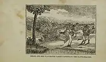 The enslavement of the Pequots reached its apex in May 1637, when English colonists and their Mohegan and Narragansett allies attacked and massacred hundreds of Pequot men, women, and children near the Mystic River.[18] The surviving captives, mostly women and children, were enslaved and divided amongst the victors and spread throughout region. The colonial militia took many captives directly, having been promised slaves as a reward for fighting. This resulted in a scramble to claim the most promising captives. Israel Stoughton hinted at the grotesque process in a letter to John Winthrop, the Governor of Massachusetts, in 1637: "ther is one [Pequot]... that is the fairest and largest that I saw amongst them... it is my desire to have her for a servant.... Liftenant Davenport also desireth one, to witt a tall one that hath 3 strokes upon her stummach."[19] Captives not taken by individual militiamen were brought to Boston, where colonial leaders used them as field laborers and household servants, or sold them to English colonies in the Caribbean.[20][21]