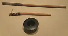 Ancient tattooing was most widely practiced among the Austronesian people. It was one of the early technologies developed by the Pre-Austronesians in Taiwan and coastal South China prior to at least 1500 BCE, before the Austronesian expansion into the islands of the Indo-Pacific.[7][8][9] It may have originally been associated with headhunting.[10] Tattooing traditions, including facial tattooing, can be found among all Austronesian subgroups, including Taiwanese Aborigines, Islander Southeast Asians, Micronesians, Polynesians, and the Malagasy people. For the most part Austronesians used characteristic perpendicularly hafted tattooing points that were tapped on the handle with a length of wood (called the "mallet") to drive the tattooing points into the skin. The handle and mallet were generally made of wood while the points, either single, grouped or arranged to form a comb were made of Citrus thorns, fish bone, bone, teeth and turtle and oyster shells.[7][11][9][12]