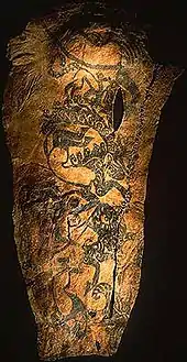 Cemeteries throughout the Tarim Basin (Xinjiang of western China) including the sites of Qäwrighul, Yanghai, Shengjindian, Zaghunluq, and Qizilchoqa have revealed several tattooed mummies with Western Asian/Indo-European physical traits and cultural materials. These date from between 2100 and 550 BC.[3]