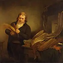 According to John W. Moyer in another one of his works for Encyclopedia Americana, one of the earliest published works on taxidermy is R. A. F. de Reaumur's Treatise, which was published in 1749.[5] In this work, Reaumur discussed the preservation of skins of birds; however, because his plan was simply to mount birds with wires – as had been done over two centuries before – it did not find much favor among other taxidermists.[3] Instead, his method spurred the development of a new system of preservation in which one cut the skins longitudinally into halves, filled one half with plaster, fixing the skin to a backboard, inserting an eye, painting on a beak and legs, and then mounting the bird in a framework of glass.[3] For the next several decades, this process became the standard method of European taxidermists.