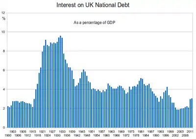 At the beginning of the 20th century the national debt stood at around 30 percent of GDP.[5] However, during World War I the British government was forced to borrow heavily in order to finance the war effort. The national debt increased from £650 million in 1914 to £7.40 billion in 1919.[7]