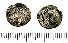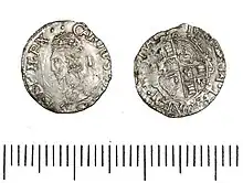 The Commonwealth of England (1649–60) is well known for having produced the only English coins which did not contain any Latin inscription at all. This was due to an association of Latin with Catholicism.[1] As far as the Commonwealth penny is concerned, the inscriptions are totally absent. The reverse shows St George's shield within a wreath, while the obverse shows St George's shield and an Irish shield, with the denomination I above them.
