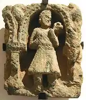 Several depictions of Greeks in Central India dated to the 2nd-1st century BCE are known, such as the Greek soldier in Bharhut, or a frieze in Sanchi which describes Greek-looking foreigners honouring the Sanchi stupa with gifts, prayers and music (image above). They wear the chlamys cape over short chiton tunics without trousers, and have high-laced sandals. They are beardless with short curly hair and headbands, and two men wear the conical pilos hat. They play various instruments, including two carnyxes, and one aulos double-flute.[19] This is near Vidisa, where an Indo-Greek monument, the Heliodorus pillar, is known.