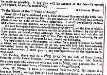 The death of the Levy's second son, aged 8 months in 1845 was, Hort wrote to the Chronicle, "our first Jewish corpse" and the "first Jewish burial" in the new Jewish cemetery.[26] Throughout the early 1840s, Hort's letters to the London Jewish Chronicle and the Voice of Jacob reveal the difficulty of maintaining a Jewish community that could barely muster a minyan, owing to the demands of making a living, and complaining how few Jewish shopkeepers respected the sabbath by closing their doors, let alone celebrating Jewish holidays properly. A Māori massacre,[27] the threat of forced militia service for all, and the extreme difficulty of making a living, took their toll on the small community. Isolation rapidly gave way to intermarriage. Solomon Levy quickly married Jane Harvey, the 14-year-old Christian shipmate of Esther Solomon and Elizabeth Levy. Although only one of his eight surviving children chose Judaism as a religion, Levy helped found the first Wellington synagogue and taught Hebrew to Jewish children for many years.[28]