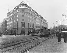 The tramways of Oslo experienced a higher ridership and several sabotage actions during the Second World War.[32] During the "April Days of 1940", rumour had it that Oslo was going to be bombed, and the tram service was therefore stopped for half an hour that day.[33] Later, on 19 December 1943, an explosion at the ammunition supply at Filipstad caused a total stop of tramway service from 14:30 a.m.[34] A small explosion accident also took place at Vålerenga Depot in December 1944.[35] On 31 December 1944, a tram was hit by an airbomb at Drammensveien (now Henrik Ibsens gate) next to the Palace Park, where all passengers but the conductor were killed.[35]