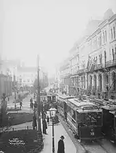 The horsecar system was more expensive to operate than electric trams, and Christiania (later Kristiania) Elektriske Sporvei ("Kristiania Electric Tramway") was founded to establish an electric tram service. The initiative came from the engineers H. E. Heyerdahl, A. Fenger-Krog and consul L. Samson.[7] KSS immediately attempted to buy the company, but the purchase failed. On 2 March 1894, the Briskeby Line opened, which ran westwards from the Østbanen station (Oslo East station) via the city centre and Briskeby to Majorstuen,[8] using a 600 volt supply.[9] At the same time, a branch line opened from the Briskeby Line at Slottsparken, heading further west to Skillebekk.[10] At first a shuttle service was provided on the branch line, but by April a through service was offered to Østbanen station. The branch line was extended to Nobels gate on 31 December 1894, to Thune in 1901 and to Skøyen station on 21 June 1903 and is now known as the Skøyen Line.[11]