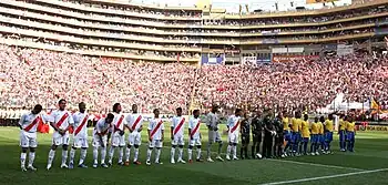 The participation of Peru in the 1970 FIFA World Cup was particularly memorable when the squad caused surprise as they advanced into the quarterfinals by defeating Bulgaria 3–2 and Morocco 3–0,[46][47][48] and despite losing 3–1 to Germany.[37][49] Although Peru lost the quarterfinal game to Brazil by 4–2,[50][51] la Blanquirroja would go on to win the Copa del Pacífico, were invited to participate in the Brazil Independence Cup, and won the Copa Mariscal Sucre.[37] Additionally, the squad won their second Copa América in 1975.[52][53][54]