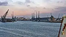 The "New Docks" opened in 1934; this was actually a single quay 7,542 ft (2.299 km) along with 400 acres of associated reclaimed land. At the western end of this was the seventh dry dock, the King George V Graving Dock, which opened in July 1933.[16] The New Docks could accommodate the Queen Mary or the RMS Queen Elizabeth, the largest passenger ship to be built for 56 years. The New Docks are currently known as the Western Docks. West of the dry dock, a container port was developed from 1965 with the first quays opening a couple of years later.[17] Further expansion took place in the 1970s, 1990s[17] and 2010s.