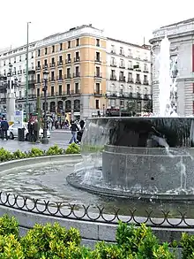 At the end of the renovation of the Gate on June 24, 1860, a fountain was inaugurated circumscribed in a basin of eighteen meters in diameter; this fountain raised a jet of water to more than thirty meters, coming from a "mouth" of seven centimeters of diameter and was located right in the center of the square. A subway channel seventy-seven kilometers long, coming from the Lozoya River, provided the necessary supply to feed the first reservoir of the Canal de Isabel II. This reservoir supplied the new neighborhoods of the widening of Madrid as well as the flow of this fountain. The canalization work is considered one of the first of the Canal de Isabel II. The day of its inauguration was attended by Queen Isabella II, and to the general surprise of those present when the powerful jet of the fountain was activated, the writer Manuel Fernández y González exclaimed: "Oh marvel of civilization, which makes rivers stand up!" (Spanish: "Oh maravilla de la civilización, que pone los ríos de pie!".)[55] The writer's phrase was very popular at the time, and numerous newspapers echoed it. Over the years the fuente del chorro ("fountain of the jet" as it was called) was deactivated because the light gusts of wind deflected the high jet of water, wetting passers-by who strolled through the Puerta del Sol.[5] Finally the fountain was moved to the Plaza de Cuatro Caminos, and later to the Casa de Campo, where it still remains (today it can be seen working next to the Puente del Rey, in front of the Casa de los Vargas). On February 19, 1862, a more modest fountain was placed to replace the previous one, and the paving of the sidewalks was completed with setts. The change caused protests among some Madrilenians due to the custom that was beginning to take root of splashing in the fountain's basin during the early morning hours on Saint John's Eve.[30]