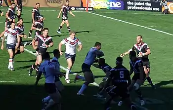 2014 began with club legend Brad Fittler making a surprise appearance in the inaugural NRL Nines at Eden Park, scoring a 70m intercept despite being 42 years old.[18] A week later, Sydney claimed their third World Club Challenge, soundly beating Wigan Warriors 36–14, with Michael Jennings scoring a hat-trick.[19] The Roosters claimed the minor premiership but were beaten in the preliminary final. This match was notable for being Anthony Minichiello's 302nd first grade game for the club, surpassing Luke Ricketson's previous record of 301. This would be Minichiello's final game for the Roosters and he also finished as the club's leading try scorer. The Roosters claimed their third successive minor premiership in 2015, but late season injuries to Mitchell Pearce and Jared Waerea-Hargreaves ultimately affected the club and they again lost in the preliminary final.