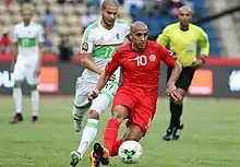 As hosts, Tunisia did not have to qualify for the 2004 African Cup of Nations,[26] where they face DR Congo, Rwanda and Guinea in the first round. The team won his opening match against Rwanda 2–1,[27] thanks to goals from Ziad Jaziri and Francileudo Santos, despite the expulsion of Selim Benachour in the 60th minute with a red card.[28] The second match against DR Congo is difficult until the Congolese Lomana LuaLua is sent off with a red card in the first half, after a frank attack on Jawhar Mnari. Thanks to Hatem Trabelsi on the right flank, the team managed to win the match 3–0 with a double from Dos Santos in the 55th and 87th minutes and a goal by Najeh Braham in the 65th minute.[29] On the day of the third match, corresponding to eid al-Adha, 35,000 spectators came to the stadium. Guinea managed to snatch the equalizing point after the end of the game with the score at 1–1,[30] Benachour scoring Tunisia's goal in the 58th minute, followed by a Guinean goal from Titi Camara in the last minutes of the match.[31] Tunisia qualified for the quarter-finals on top of the group with seven points, after two wins and a draw.