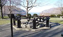 Between 1778 and 1780, Polish engineer and military hero Tadeusz Kościuszko oversaw the construction of the garrison's defenses.[6] Kościuszko's small garden retreat still stands today as Kosciuszko's Garden. The Great Chain and high ground above the narrow "S" curve in the Hudson River enabled the Continental Army to prevent British ships from sailing up river and dividing the Colonies.[7][8] Because of the unique bend in the river, ships of the day had to slow down to a near complete stop to navigate the turn. Though never tested, the chain performed its purpose by preventing British movement up river. Several forts and redoubts were constructed to defend this turn in the river. The closest to the river was Fort Clinton, formerly named Fort Arnold for his victory at Saratoga in 1777.[9] The remains of this fort can be seen on the western edge of the Plain between Thayer Road and the Hudson River. A few hundred feet higher in elevation was Fort Putnam, near the site of the present day Michie Stadium. A series of smaller redoubts protected these two forts. Several are still visible, including Redoubt Four, at the highest point on the academy, and Redoubt Seven, across the river on Constitution Island. It was as commander of the fortifications at West Point that Benedict Arnold committed his infamous act of treason when he attempted to sell the fort to the British.[10][11]