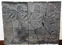 A Late Hittite relief from Carchemesh (9th century BC) shows a drum with a diameter of about a meter, carried and played by two men with shoulder-straps, while a third man whose role is not clear stands behind the drum. Reliefs from Zincirli (8th century BC) show men holding frame drums in their left hands and beating them with their right hands.[18]