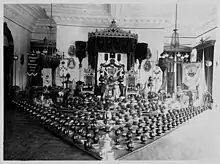 Hoʻokupu is a Hawaiian language term for gifts and offerings. The ceremony dates back hundreds of years, to a time when the average Hawaiian subsisted on manual labor, with little-to-no financial assets. Their gifts were literally the fruits of their personal labors to the Hawaiian aliʻi (rulers), or to visiting royalty. Through time, the gifts became more monetary based and a part of the monarch's wealth. Although they were allowed to approach the monarch with the gifts, they were handed to a royal attendant so as not to touch the aliʻi.[1] In 1869, the visiting Duke of Edinburgh Prince Alfred was accorded a hoʻokupu by Kamehameha V, and broke with protocol by reaching out to touch any gift-giver who wished to shake his hand.[2]