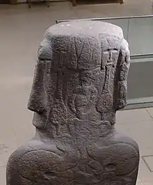 The top of the head is smooth and flat,[28] and could originally have supported a pukao, a cylindrical stone "hat". A flat round stone found near the site of the statue may have been such a hat,[29] or, if the base was flat, a bed plate on which the statue once stood.[30] It has been suggested that the statue was originally erected so that the top of the head would have been horizontal.[31]