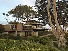 The first house, The Sunset House, built in 1957, was demolished in 2013, while the second house, the Hodgkins and Skubic House, built in 1967, is still standing. The houses, with a third one built next door, were featured in the book Santa Barbara Architecture, from Spanish Colonial to Modern which was published in 1975; of the surviving house, the book says: "A simple and effective statement using common materials of redwood, block, and glass in its construction."[1]