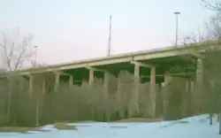 The collector (outermost) spans are steel girder bridges, and were opened in December 1965 during the widening of Highway 401 to a collector-express system.[2] The older inner bridge's balustrade railing was replaced with retaining walls (since replaced with tall walls). A conventional lighting system with truss-neck poles was added to the bridges (and the rest of the widened 401) around this time.