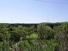The bridges can be clearly seen from Yonge Street looking northwest and north of York Mills Road and Wilson Avenue.