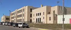 Hoisington High School was designed by the Emporia architecture firm Brinkman & Hagan and was constructed in 1940 through the Public Works Administration. The three-story brick building features Art Deco-style stone ornamentation and carved detailing. The building also includes a 1937 native stone stadium constructed by the Works Projects Administration. The property was listed on the National Register of Historic Places in 2005.