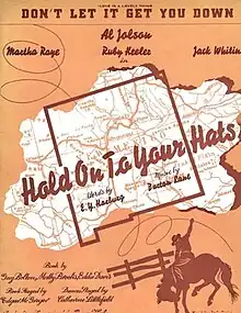 Hold On To Your Hats is a musical comedy in two acts by Guy Bolton, Matt Brooks, and Eddie Davis, with lyrics by E. Y. Harburg and music by Burton Lane. The show was lavishly[1] staged by Edgar MacGregor, with dances by Catherine Littlefield, musical direction by Al Goodman, and colorful[1] settings and costumes by Raoul Pene Du Bois. It was produced by Al Jolson and George Hale at the Shubert Theatre on September 11, 1940.[2] It ran for 158 performances, closing on February 1, 1941.[3] The cast included Jolson, Martha Raye, Jinx Falkenburg, Arnold Moss, Jack Whiting, Russ Brown, and John Randolph. It was the last show in which Jolson appeared.[4]